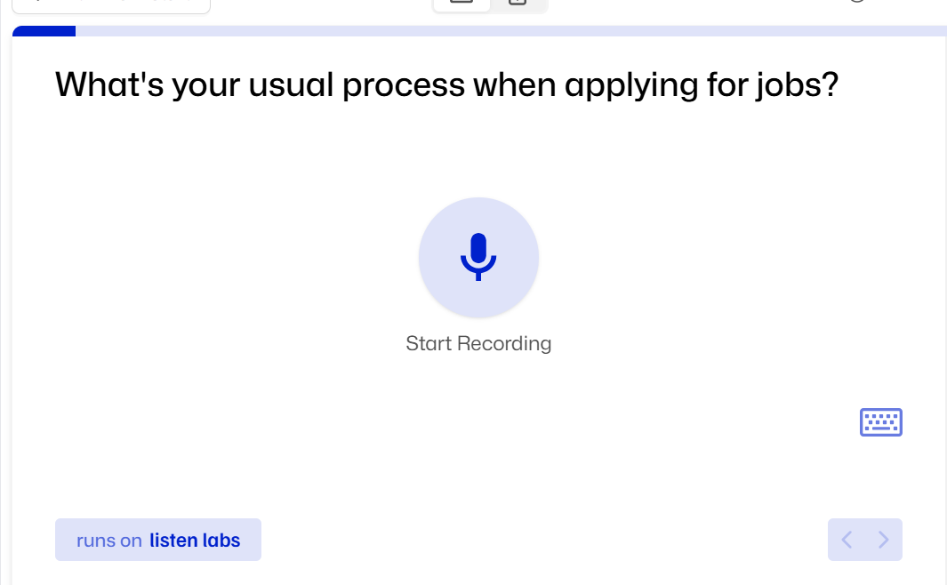 To test the effectiveness of AI in moderating interviews, I used ListenLabs to conduct structured interviews with job seekers. I refined my discussion guide by prioritizing key follow-up questions and recruited six participants through my LinkedIn network. Participants described their experience with the AI moderator as "interesting," but I observed several limitations in how it handled responses.