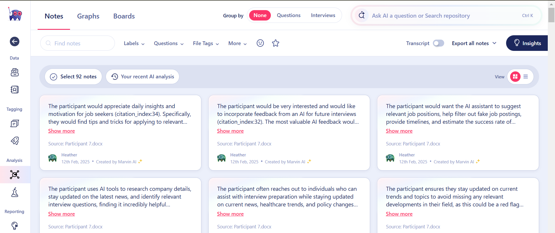 To evaluate how different AI tools process interview data, I analyzed the same set of responses using Listen Labs, Marvin, and Coloop. Each tool provided valuable insights but in distinct ways, highlighting their unique strengths and limitations.