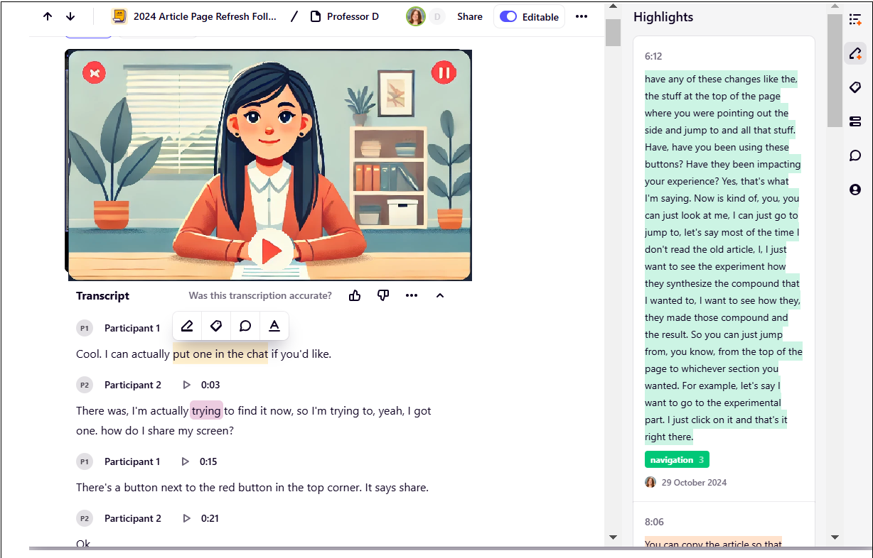 User interviews were uploaded to Dovetail for in-depth analysis and tagging of key quotes. Themes identified during the interviews were categorized and added to project insights. These findings were later shared with stakeholders, accompanied by key moments from the recordings to provide a deeper understanding and allow them to engage directly with the user feedback.