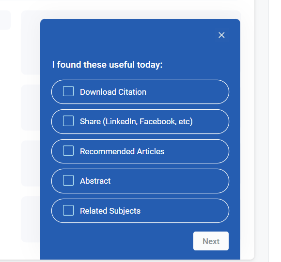 I collaborated with developers to embed a HotJar survey on the ACS Publications article page. The survey featured a question aimed at assessing the usefulness of specific page elements on that day. To ensure comprehensive coverage, two surveys were launched simultaneously, addressing all elements under consideration. Following the implementation of the new designs, a second version of the survey was deployed to gather follow-up feedback, evaluating whether users were more engaged with the targeted elements.