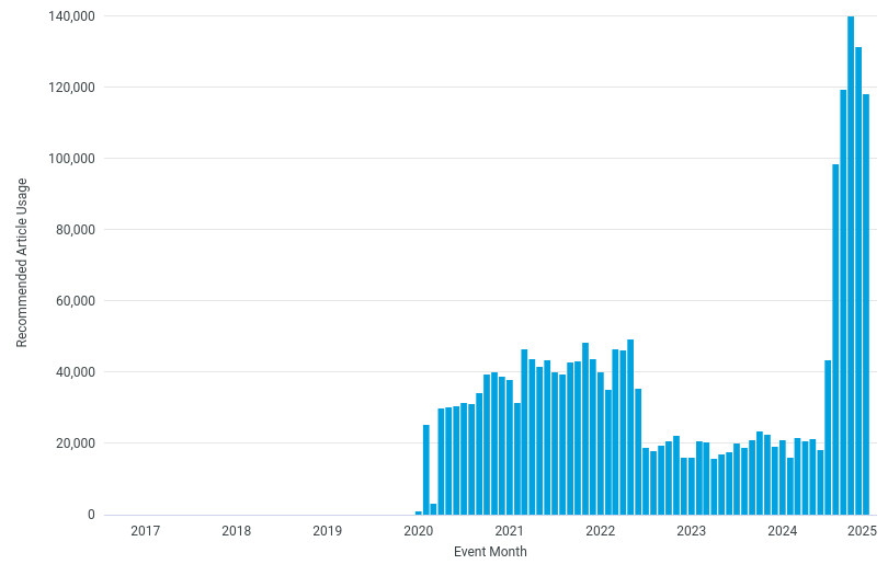 The redesign of the ACS Publications article page, guided by insights from user research, had a significant impact on user engagement. Usage of key engagement features, particularly recommended articles, increased by 600%. By enhancing these features, the redesign encourages users to explore additional relevant content, creating new pathways for research discovery. This improved experience not only drives immediate engagement but also supports long-term user retention by fostering deeper connections with the platform.