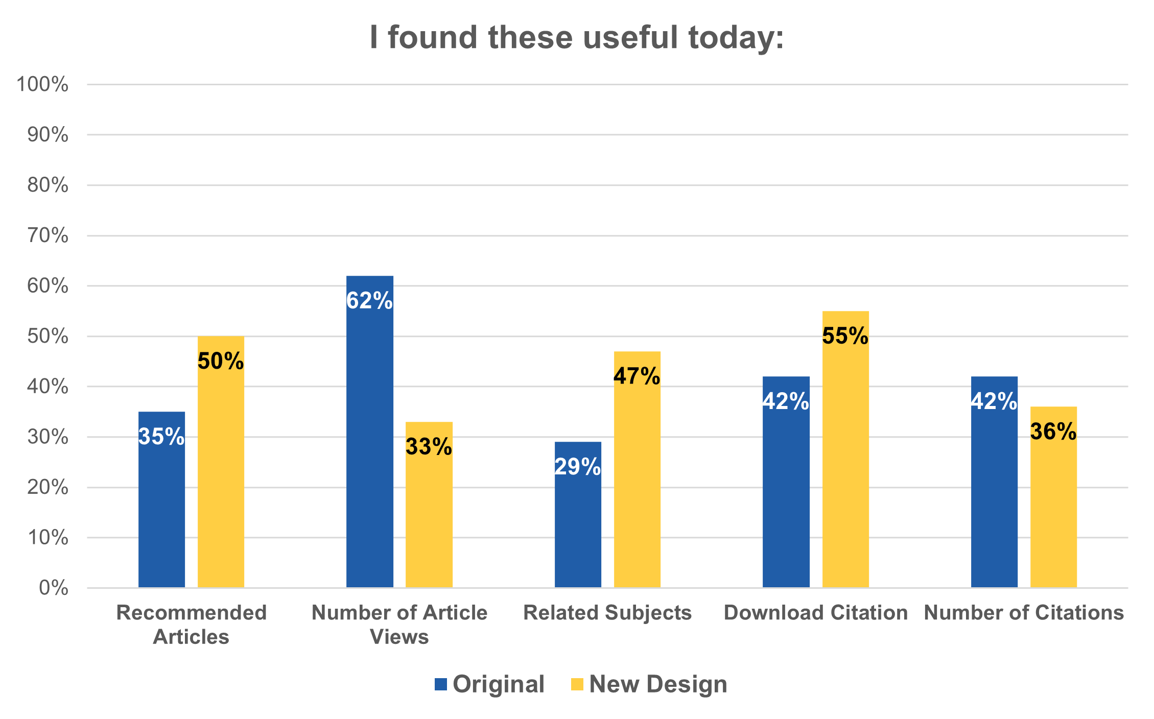 Visitors to the ACS Publications article page were surveyed to assess the usefulness of various page elements, both before and after the implementation of the new design. The results revealed a significant increase in the perceived usefulness of key engagement features, such as recommended articles and related subjects. Conversely, less critical elements, such as the number of citations and views, showed a decline in importance, reflecting the new design’s strategic focus on prioritizing user-relevant content.
