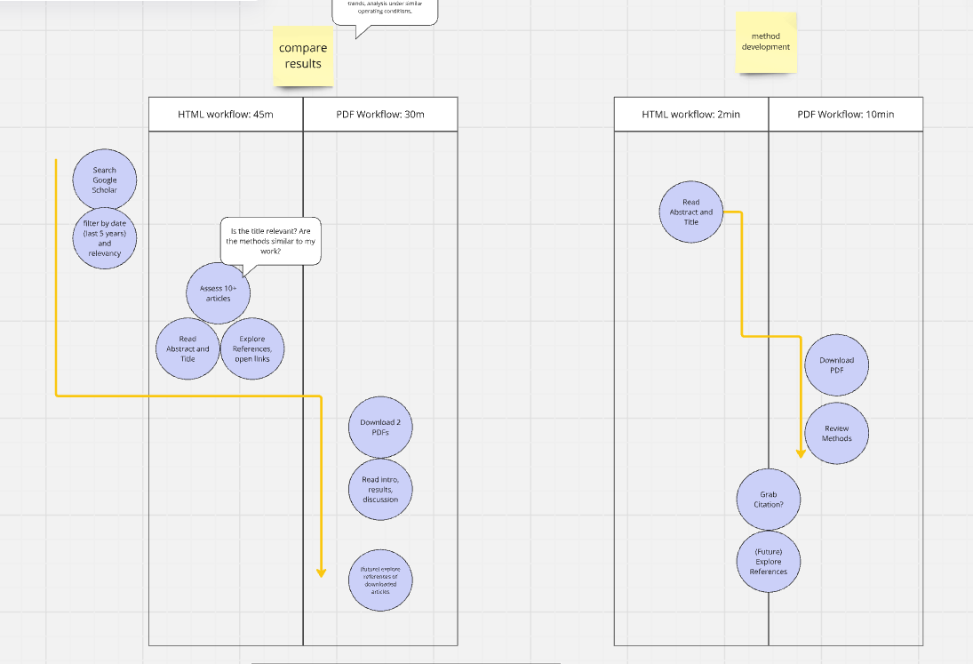 In follow-up interviews, participants were asked to walk through their process for completing the most common HTML workflow—assessing an article's relevance. Insights from these interviews, along with data from other user discussions, were synthesized to create a detailed map of the user journey for this specific workflow, highlighting key steps, decisions, and pain points.